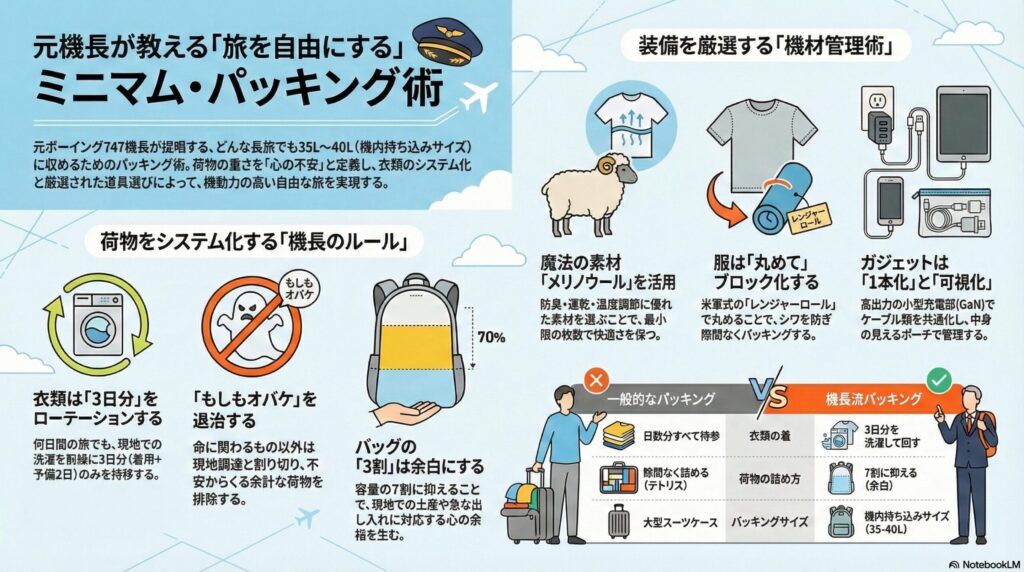 今日は、私がフライト生活の中で培ってきた、「荷物を減らして、旅を最高に楽しむためのパッキング術」をお話しします。厳しい訓練の話ではありません。誰でも次の旅から実践できる、身軽になるためのヒントです。