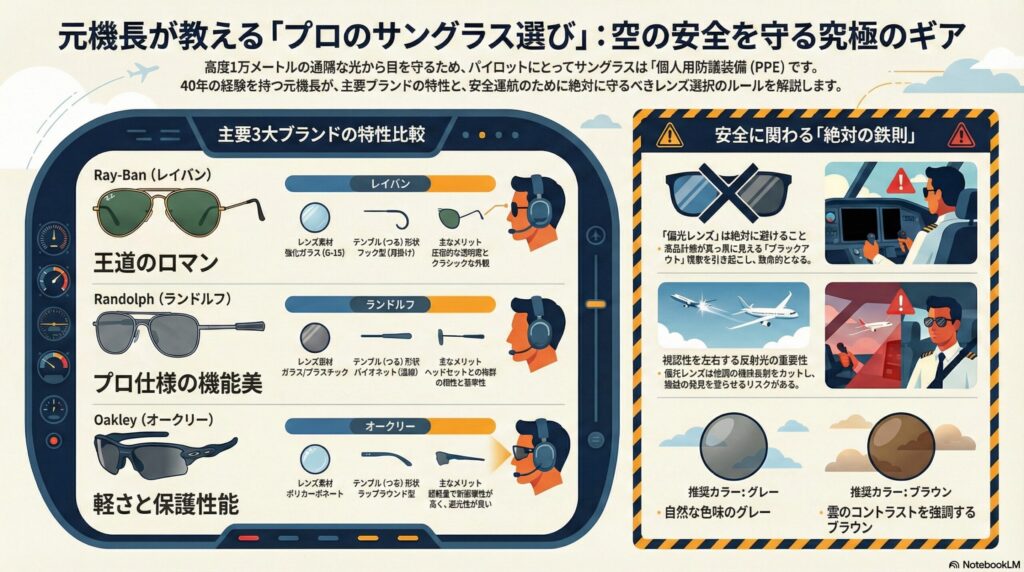 たかがサングラス、されどサングラス。 高度1万メートルの世界では、その一本があなたの疲労度を左右し、ひいては安全運航(セーフティ)に関わります。