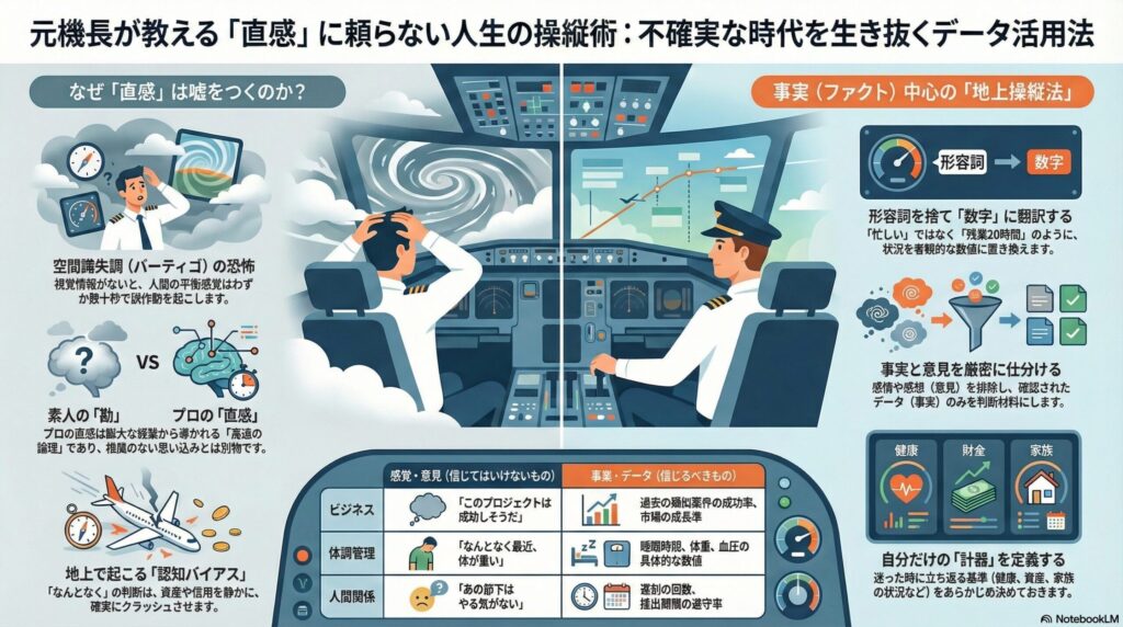 だからこそ、私たちパイロットは訓練の初日に、こう口酸っぱく教わります。 「自分の感覚(直感)ではなく、計器(事実)を信じなさい」